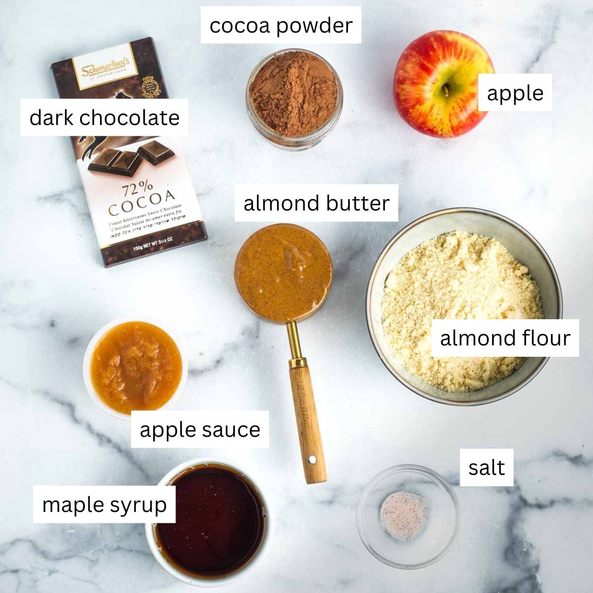 - Sprinkle on almond flour, cacao powder and salt and mix until dry ingredients are fully incorporated into the wet.