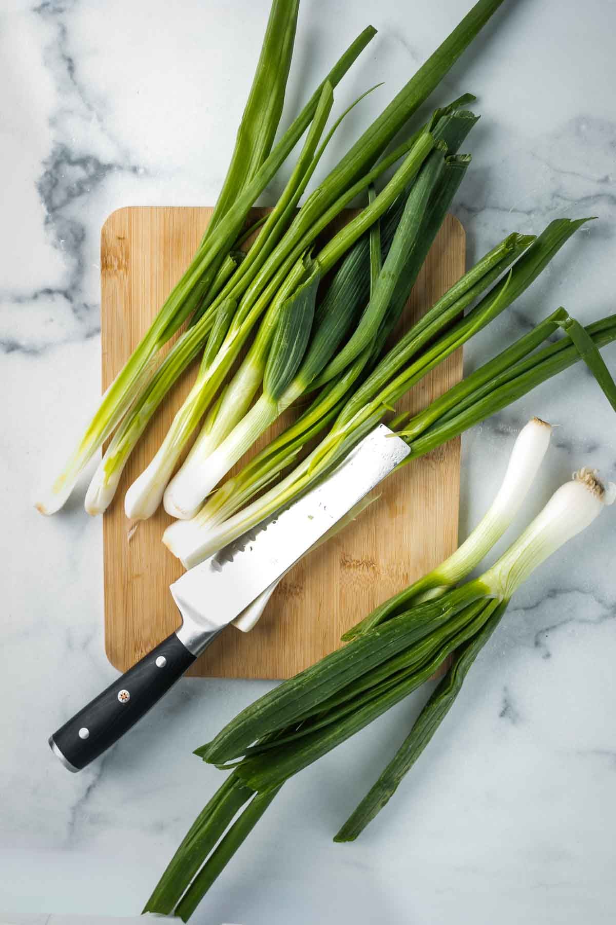 Wash and trim scallions. Slice lengthwise in half.